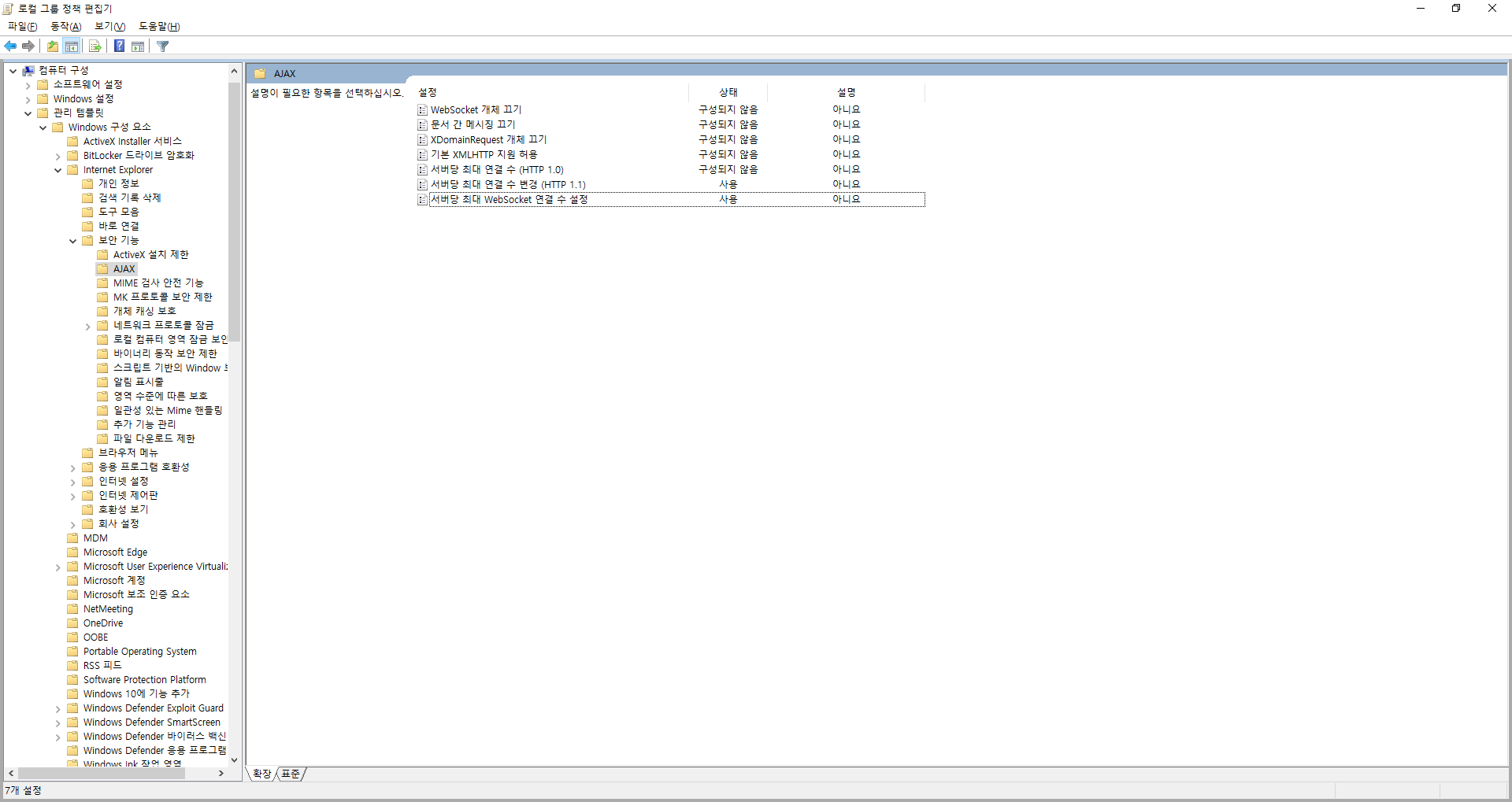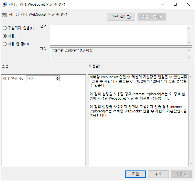 [ 컴퓨터 구성 / 관리템플릿 / Windows 구성 요소 / Internet Explorer / 보안 기능 / AJAX / 서버당 최대 WebSocket 연결 수 설정 ]